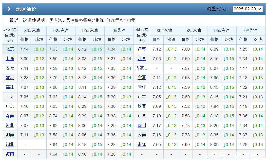 与此同时,在国内成品油市场,2月19日(本周三),今年第4次油价调整,国内油价一夜“变了天”,2025年汽柴油“首降”来袭,主流加油站92,95号汽油以及0号柴油下降了0.13~0.14元/升,目前,各地油价已更新,大家参考文末配图!